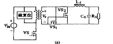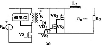 當主開關管VS 關斷時,勵磁電流流經磁復位電路。變壓器次級電壓反向,VS1 和VS3 關斷。VS2 的柵2源極寄生電容由流經VD 的電流充電。輸出電流由VS2 續流。在t2 時刻,磁復位結束,變壓器次級電壓為零。因為VD1 承受反壓截止,VS3 關斷,VS2 的柵極驅動電壓不變,因此即使變壓器次級電壓為零,VS2 保持導通續流。VS2 柵極驅動電壓一直保持到下一個開關周期開始,且VS3 導通之時。這就解決了死區時間內體二極管導通的問題。