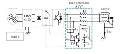 傳統的用于消除共模電壓的有源濾波器如圖8所示,文獻將其稱為有源共模噪聲消除器,acc連接在逆變器的輸出端和三根電纜之間,由共模電壓傳感器、補償電路和共模變壓器組成,acc在逆變器輸出端疊加一個補償電壓,該補償電壓與pwm逆變器產生的共模電壓極性相反、幅值相等,從而使施加在負載上的共模電壓被完全消除,也就減小了共模電流和傳導emi。