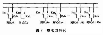 繼電器陣列由3168個繼電器實現了1536個測試點之間的導通/絕緣測試和繼電器組之間的隔離。1 536個測試點分布在12塊單板上面,每塊單板上面有128個測試點,單板內又分為16行,每行8列,即12×16×8=1 536。每一個測試點由兩個繼電器控制,分別是輸入繼電器(Kat)和輸出繼電器(Kab)。每塊單板對應外部的一個128芯的航空插頭,負責和被測產品的連接。其原理如圖2所示。