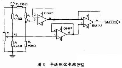 由于導通電阻很小,一般為歐姆級,容易受到外界干擾的影響,惠斯登電橋的兩臂同時對電源的微小變化做出反應,將輸出信號送入差分放大器,從而消除了共模干擾,可以提高測試的準確性。其原理如圖3所示。