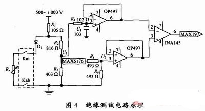 對于絕緣測試電路而言,由于輸入測試電壓為500~1 000 V,對干擾不太敏感,所以絕緣測試電路采用相對簡單的電阻分壓法來實現。