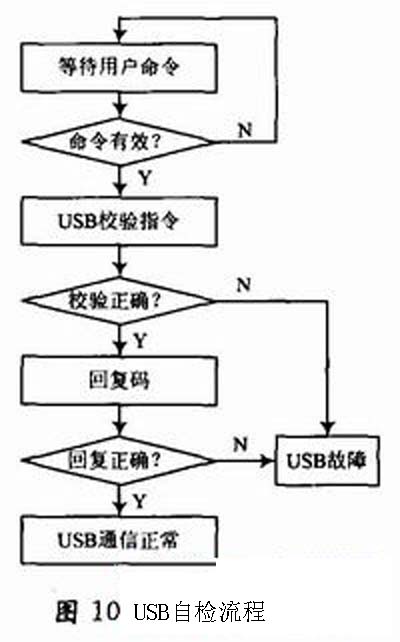 為了保證設備本身的工作正常,電纜測試系統提供自檢功能。自檢流程分為兩部分,第一部分對USB通道進行自檢,USB自檢流程如圖10所示。系統上電后,工控機發送校驗指令,單片機判斷校驗碼是否正確,在校驗碼正確的情況下,按照協議返回復碼,工控機判斷回復碼正確的情況下,USB通信建立正常。第二部分是對繼電器陣列進行自檢,其流程與導通測試類似。以測試點1和測試點2為例,首先,閉合測試點1的輸入繼電器,采樣測試電壓,如果系統判斷為斷開,則可以說明測試點1的輸出繼電器沒有常閉,反之則說明為常閉故障。把測試點1的輸入繼電器更換為輸出繼電器,采用同樣的方法可以判斷出測試點1的輸入繼電器是否為常閉故障。其次,分別打開測試點1的輸入和輸出繼電器,如果系統判斷為導通,在第一步的基礎上就可以說明兩個繼電器均正常;如果系統判斷為斷開,則兩個繼電器中至少有一個為常開故障。最后,在外部端口上接入自檢插頭,分別選擇測試點1的輸入繼電器和測試點2的輸出繼電器,如果系統判斷為導通,則可以說明內部繼電器和單板到端口的引線正常,反之則說明繼電器到測試端的引線出現問題。