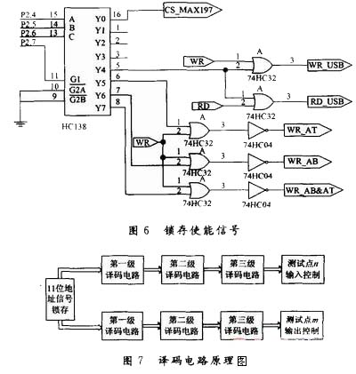 繼電器譯碼電路的作用是在單片機的控制下將1 536個測試點中的某兩個測試點接入相應的測試電路。比如譯碼電路選中測試點1的輸入繼電器Kat和測試點2的輸出繼電器Kab,外部的被測電纜通過這兩個測試點接入相應的測試電路,從而實現了導通或者絕緣測試。為了實現這樣的功能譯碼電路可以分為地址鎖存電路,輸入繼電器譯碼電路和輸出繼電器譯碼電路。以輸入地址鎖存電路為例,其原理如圖5,圖6所示。