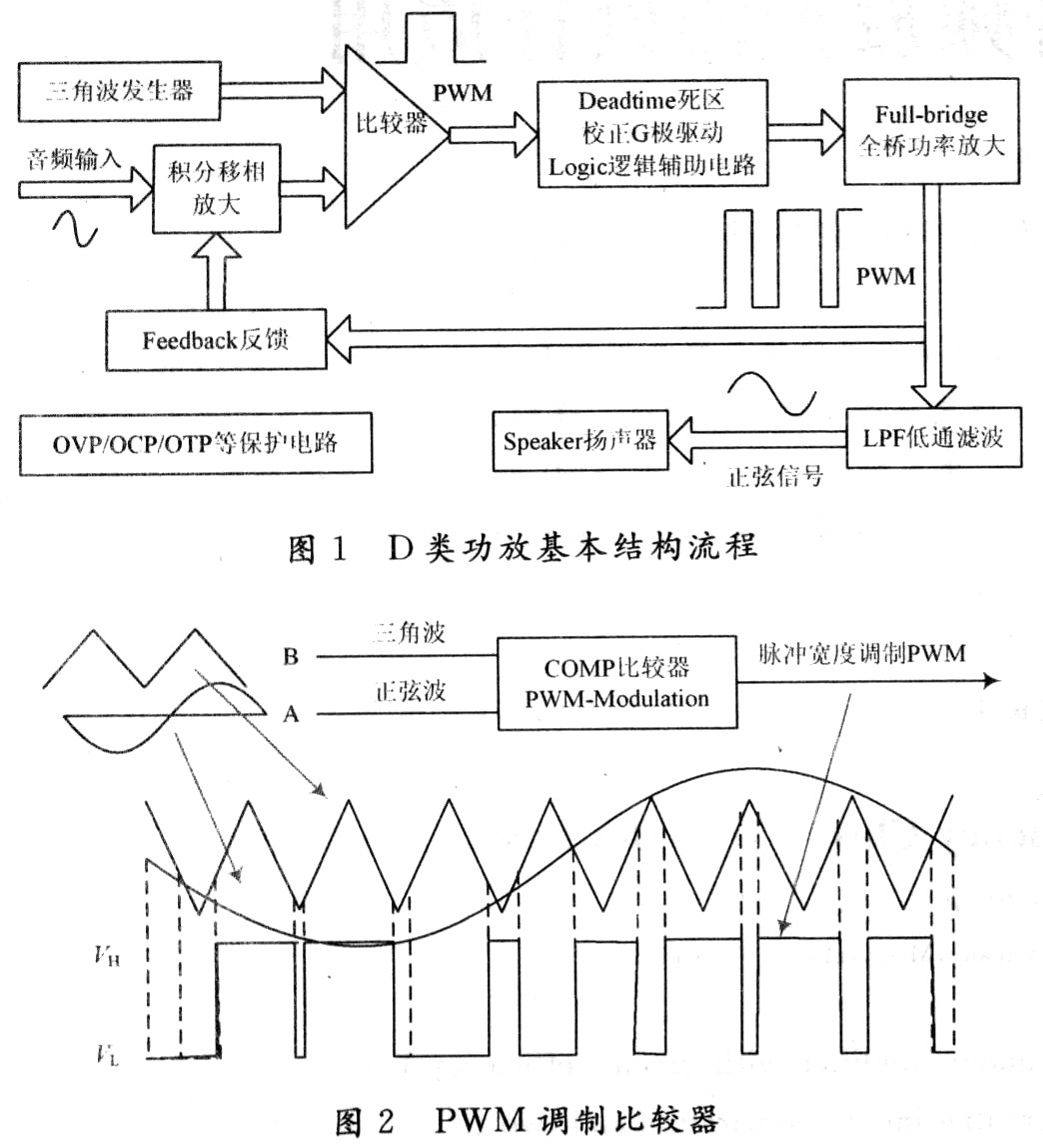 D類放大器由積分移相、PWM調制模塊、G柵級驅動、開關MOSFET電路、Logic輔助、輸出濾波、負反饋、保護電路等部分組成。流程上首先將模擬輸入信號調制成PWM方波信號,經過調制的PWM信號通過驅動電路驅動功率輸出級,然后通過低通濾波濾除高頻載波信號,原始信號被恢復,驅動揚聲器發聲,如圖1所示。