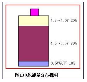 目前手機(jī)使用的電池都是鋰離子電池,在手機(jī)工作時(shí),電池不斷放電,電池電壓不斷下降,電池放電的電流不同,電壓下降的曲線速率也不同,一般來(lái)說(shuō),在電池電壓3.5V~4.2V之間集中了90%的電池能量。電池能量分布如下圖所示。
