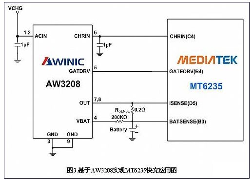 上海艾為電子專門針對(duì)MT6235/36平臺(tái)推出的AW3208在增加OVP功能的同時(shí),提供了智能充電功能,以滿足快速充電的功能。如圖2所示,AW3208內(nèi)置專有的K-ChargeTM技術(shù),可根據(jù)芯片溫度智能調(diào)整輸出電流,以保證在充電期間整個(gè)充電系統(tǒng)的安全。使得手機(jī)在實(shí)現(xiàn)快速充電的時(shí)候不會(huì)因?yàn)橛捎诃h(huán)境溫度較高或者充電電流過(guò)大導(dǎo)致芯片進(jìn)入過(guò)溫保護(hù)使得充電沒(méi)法正常進(jìn)行。圖3為在MT6235上的典型應(yīng)用圖。