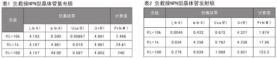 為了說明晶體管負載的不同接法對驅動電路的影響,我們借助Multisim 10 仿真軟件分析負載電阻為100、1k、10k 情況下圖3(a)、(b)中電路的各個參數,得到的仿真結果如表1 和表2 所示。