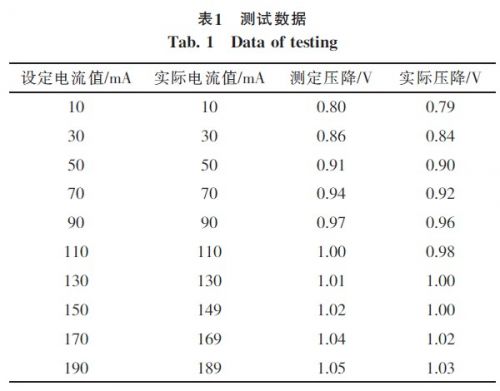 被測(cè)二極管采用1N4118,用2個(gè)優(yōu)利德數(shù)字萬用表UT33D作為測(cè)量儀器對(duì)系統(tǒng)進(jìn)行測(cè)試,其中一個(gè)以毫安檔(量程200mA)與被測(cè)二極管串聯(lián),另一個(gè)以直流電壓檔(量程5V)與被測(cè)二極管并聯(lián),在不同的設(shè)定電流值下測(cè)量二極管的實(shí)際電流和電壓,測(cè)試結(jié)果如表1。