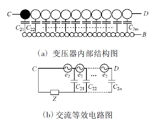 在僅二次繞組有感應電動勢、一次繞組電動勢為零的情況如圖6 所示。圖6 中:e2為每匝二次繞組的感應電動勢;C2x為一匝二次繞組與一次繞組最外層間的寄生電容。