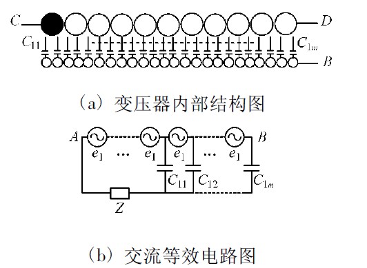 以圖3 所示的變壓器為例,最上層一次繞組與二次繞組間的寄生電容最大,是產生共模傳導EMI 的主要原因,故以下主要分析這兩層間分布電容對共模傳導EMI 的影響,忽略變壓器其他繞組對共模傳導EMI 的影響。