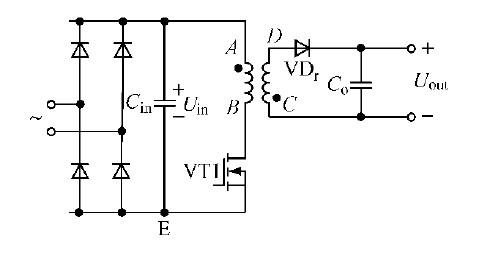 以反激式變換器為例,其主電路如圖1 所示。開關管開通后,變壓器一次側電流逐漸增加,磁芯儲能也隨之增加。當開關管關斷后,二次側整流二極管導通,變壓器儲能被耦合到二次側,給負載供電。
