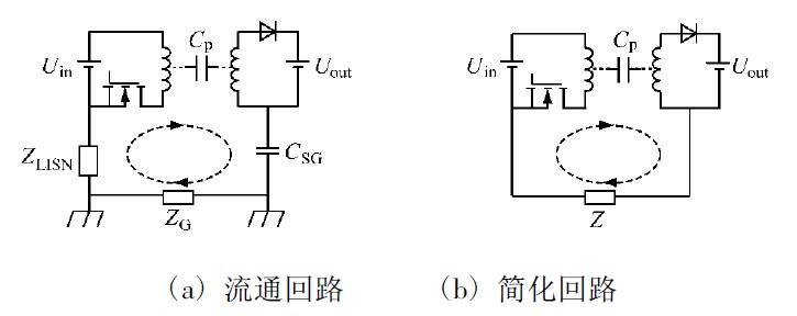 具體到變壓器中,一次繞組與二次繞組之間的電位差也會產生高頻變化,通過寄生電容的耦合,從而產生了在一次側與二次側之間流動的共模傳導EMI 電流。交流等效回路及簡化等效回路如圖4所示。圖4 中:ZLISN為線性阻抗穩定網絡的等效阻抗;CP為變壓器一次繞組與二次繞組間的寄生電容;ZG為大地不同點間的等效阻抗;CSG為輸出回路與地間的等效電容;Z 為變壓器以外回路的等效阻抗。