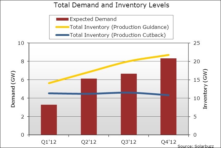 在產(chǎn)能過剩的情況下,如果不能有效控制產(chǎn)量,明年年底組件庫存有可能飆升至22GW。為了使庫存天數(shù)維持在與2011年底一樣的水位,產(chǎn)量需要比廠商的計劃減少約11GW。
