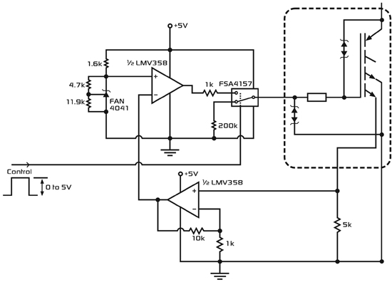 控制裸片和IGBT結(jié)合在多引腳的TO-220或TO-263封裝中。IGBT焊接在封裝件的管座(header)上,以最大限度降低IGBT與封裝件間的電阻和熱阻。控制裸片用絕緣的聚酰亞胺材料粘貼在同一管座上,使其與IGBT的高壓集電極隔離。