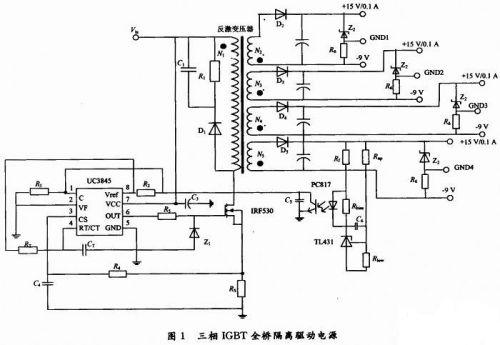 三相IGBT全橋隔離驅動電源采用電流型PWM控制器LIC3845,輸出4路相互隔離的+15 V/-9 V,如圖1所示。其中,一路額定輸出電流為0.2 A,用于三相全橋下橋臂共射極連接的3個IGBT的驅動供電,另外3路額定輸出電流為0.1 A,分別用于上橋臂的3個IGBT的驅動供電。