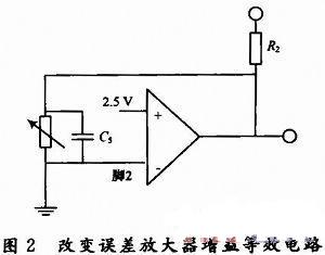 變壓器+15 V,-9 v/0.2 A一路輸出電壓通過TL431a和光耦PC817反饋到UC3845的1腳,UC3845的2腳接地,UC3845內部誤差比較放大器的輸入誤差總是固定的,將PC817的光電晶體管視為可變電阻,1腳的反饋信號改變的是誤差比較放大器的增益,其等效電路如圖2所示。