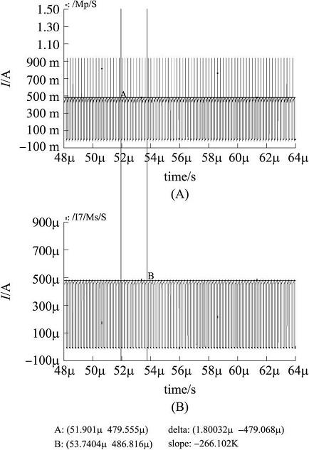 檢測(cè)精度和速度是電流檢測(cè)電路兩個(gè)重要的指標(biāo)。由于每個(gè)檢測(cè)周期的開(kāi)始階段, 電流檢測(cè)電路處于啟動(dòng)狀態(tài), 所以Is 都有一段啟動(dòng)時(shí)間。這個(gè)時(shí)間主要由電路中M9、M10管的寄生電容決定, 當(dāng)兩管的寬度和長(zhǎng)度比較小時(shí), 啟動(dòng)時(shí)間很短, 相反, 啟動(dòng)時(shí)間會(huì)變長(zhǎng)。為了保證電流檢測(cè)的精度, M9、M10兩管的L 不能太小, 現(xiàn)取1 um。
