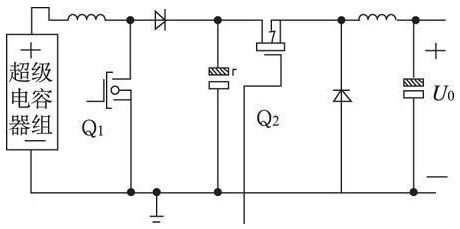 由于光伏陣列受外界環(huán)境影響較大, 本系統(tǒng)中12 V的太陽能板輸出電壓的變化范圍約為0~ 20 V,如果直接為鉛酸蓄電池充電, 由于鉛酸蓄電池的正常工作電壓要高于10. 8 V, 因此當(dāng)弱光條件下, 太陽能板的輸出電壓低于鉛酸蓄電池的端電壓時, 其產(chǎn)生的電能不能被鉛酸蓄電池吸收。因此本系統(tǒng)采用把太陽能板輸出經(jīng)過超級電容器組, 再由超級電容器組先經(jīng)升降壓后為鉛酸蓄電池充電, 有效增強系統(tǒng)弱光充電能力, 提高利用效率。
