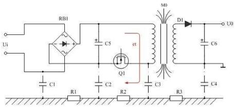 值得一提的是,開關電源變壓器初級線圈的漏感產生的反電動勢et,在所有干擾信號之中是最不容忽視的,如圖3所示。當電源開關管關斷的時候,開關電源變壓器初級線圈的漏感產生的反電動勢et幾乎沒有回路可釋放,一方面,它只能通過初級線圈的分布電容進行充電,并讓初級線圈的分布電容與漏感產生并聯諧振;另一方面,它只能通過輻射向外進行釋放,其中通過對地電容C3與大地相連,也是反電動勢et釋放能量的一個回路,因此,它對輸入端也會產生共模信號干擾。