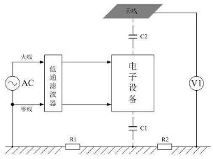 輻射干擾一般是通過電磁感應的形式在空間進行傳播的,圖4是測試電子設備產生輻射干擾的基本方法,或表示電子設備產生的干擾信號通過電磁感應向空中輻射的原理。圖4中,電子設備表示干擾信號源,V1表示測量儀表,C1表示電子設備對大地的電容,C2表示電子設備與天線偶合的電容,即:電子設備通過電場對天線產生感應,這里的天線也可以看成是被干擾的設備。圖4的測試方法就是測試電子設備周圍規定距離某處的電磁場強度,由于干擾信號一般都是一個頻率成份非常豐富的非正弦波,因此,無法對它進行直接測量,只能對它其中某一個頻率信號單獨進行測量。
