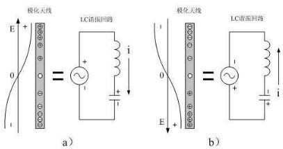 天線來回極化的工作原理可以等效成一個串聯諧振電路,當天線在電場力的作用下被極化帶電時,它又相當于一個電容在充電;當天線中的載流子在電場力的作用下來回移動時,它又相當于一個電感,并且在天線的周圍會產生磁場。