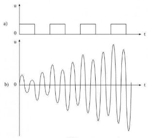圖6是諧振回路產生諧振的工作原理圖。圖6-a)是一個含有諧波分量非常豐富的電壓方波,圖6-b)是LC串聯回路產生諧振時的電壓波形。當電壓方波作用于LC串聯回路時,方波的前后沿都會對LC串聯回路產生激勵(即接收能量),每次激勵過后又會產生阻尼振蕩(即損耗能量),當輸入電壓波形的上升率dv/dt值大于諧振回路波形(正弦波)的上升率時,電路就會產生激勵;當輸入電壓波形的上升率dv/dt值小于諧振回路波形的上升率時,電路就會產生阻尼。