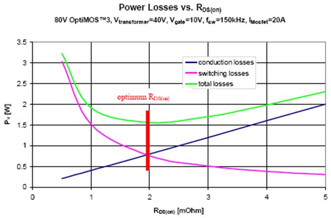 這個MOSFET選擇方法,是在假定應用具備最優開關性能的條件下計算得到的。如果發生了諸如動態開啟或雪崩等二階效應,那么這個優化表可能不準確。此外,硬開關轉換器拓撲可實現最佳結果。任何諧振軟開關拓撲均可能導致失配,因為可以回收利用開關過程產生的部分電量。在這種情況下,實際最優RDS(on) 值將低于計算得到的值。請注意,一次側采用準諧振拓撲(例如相移ZVS全橋)也可使二次側的同步整流實現硬開關性能,從而也可以利用這種設計優化表來進行優化。