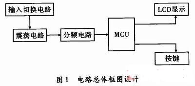 如圖1所示。框圖包括輸入切換部分、振蕩部分、分頻部分、單片機(jī)部分、顯示部分和鍵盤部分。此系統(tǒng)由STC89C51單片機(jī)作為控制核心,輸入切換部分采用雙刀雙擲繼電器完成待測電容或電感的線路切換,振蕩電路工作在放大諧振狀態(tài),頻率有高頻管9018的集電極輸出,由于頻率較高,所以需經(jīng)過信號分頻,再者由于輸出的電壓幅度大,此處無需再加一級驅(qū)動,以74LS393數(shù)字分頻芯片,把分頻端級聯(lián)實現(xiàn)100分頻,最終信號進(jìn)入單片機(jī),由單片機(jī)計算出頻率,經(jīng)過算法設(shè)計,實現(xiàn)未知電容或電感參數(shù)的測定。圖1給出了系統(tǒng)的總體框架圖。