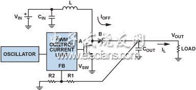 使用肖特基二極管代替開關B的調節器定義為異步 (或非同步), 調節器,而使用FET作為開關B的調節器定義為同步調節器。圖3中,開關A和B已分別使用內部NFET和外部肖特基二極管來實施,從而形成異步升壓調節器。對于需要負載隔離和低關斷電流的低功耗應用,可添加外部FET,如圖4所示。將器件的EN引腳驅動至0.3 V以下便可關斷調節器,使輸入與輸出完全斷開。