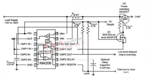 圖 6 顯示了電流與兩個電壓結點比較的電路。較低的電壓結點激活警報輸出,我們可為其配置一個適當?shù)难舆t電路,以避免錯誤的瞬態(tài)觸發(fā)。較低的電壓結點在比較器輸入端內置閾值為 0.6V。Q1 為較高電壓結點輸出提供緩沖,通過電源開關 MOSFET 關閉電源,如果電流超過上限則啟用 Q2。較高電壓結點采用 INA206 的 1.2V 參考電壓,INA206 具有避免在沒有鎖存功能的電壓結點發(fā)生振蕩的鎖存功能。