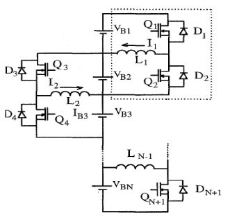 開關電感法可以實現相鄰電池單體間能量的同時傳遞,可以減少均衡時間,對于N 個蓄電池單體,需要2N-2 個MOSFET 和N-1 個電感。