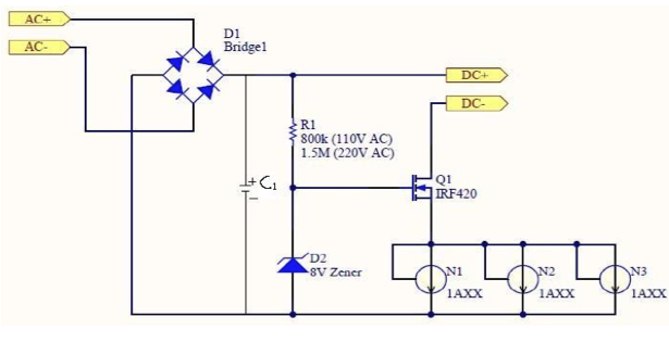 有不少現成的恒流二極管的耐壓往往不夠高,當然最簡單的方法就是用兩個或幾個恒流二極管串聯。同樣這樣成本就會增高。也可以用增加一些其它器件來提高。