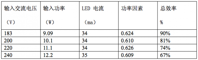 下面舉一個實測的結果為例,這是一個80顆3014串聯的球泡燈,采用了5顆Semitek 的S-562T并聯。它在不同的輸入市電電壓時,所測得的結果如下表所示。