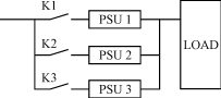 以某個輸出電流為100A的系統為例來說明冗余結構運行的好處,這里只討論1+1,2+1,3+1三種工作方式,如圖2所示。各電源模塊的工作情況由Kn的閉合情況決定。
