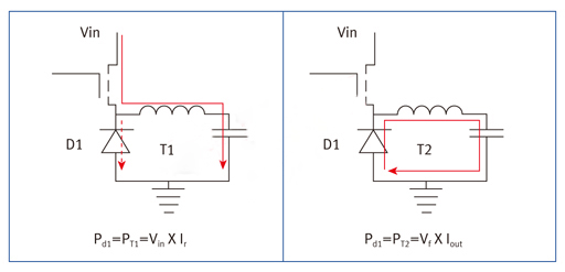 當時間為T2時,輸出電流(Iout)流經(jīng)D1。所產(chǎn)生的損耗與D1的正向電壓(Vfw)和輸出電流直接相關(guān)。PT2等于Iout*Vfw。顯然,我們希望盡可能降低以控制損耗,減少發(fā)熱。