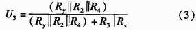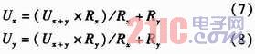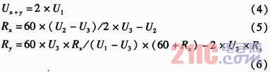 如圖2所示,U+和U-為被測線路的母線供電電壓,正常工作時兩母線間的電壓差Ux+y為440 V,且隨蓄電池內(nèi)阻變化。Rx,Ry分別為被測線路的正母線絕緣電阻和負母線絕緣電阻。正、負母線絕緣電阻反映的是64路的正、負支路的總體絕緣性能,等效于各個支路的正、負絕緣電阻的并聯(lián),正常時兩母線絕緣電阻>20 kΩ。Ux和Uy為正負母線對地電壓,大小隨正負母線的絕緣電阻變化,但兩母線電壓差恒定為Ux+y。為了檢測正負母線電壓Ux,Uy,Rx,Ry,系統(tǒng)采用了“平衡-不平衡檢測法”檢測母線電壓和母線絕緣電阻。計算公式如式(1)所示。