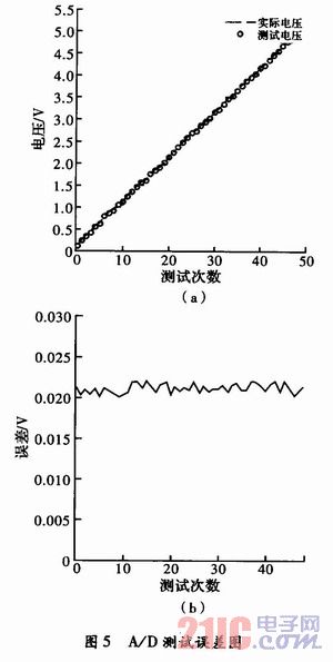 為了達到好的測試效果,A/D采集必須達到一定的測試精度,圖5是A/D采集的實測數(shù)據(jù)和測試誤差分析曲線,從圖中可以看出,A/D采集的誤差約20 mV,屬于正常范圍,因為系統(tǒng)采用8位A/D,5 V基準電壓。這個采樣精度滿足整體的設(shè)計要求。