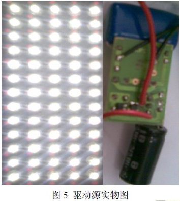 為了進(jìn)一步驗(yàn)證了基于恒流二極管的小功率LED 驅(qū)動(dòng)電路的可行性。制作了驅(qū)動(dòng)65 顆(5*15方式連接)0.06 W 白光LED 的驅(qū)動(dòng)源,其中降壓電容C1 為1.5 μF,濾波電容C2 為1000 μF,恒流二極管為兩顆2DHL040 并聯(lián),并利用萬用表對(duì)電流電壓進(jìn)行測量。實(shí)際測得輸入電壓在196~248 V范圍內(nèi)輸出電流恒定為80 mA,相當(dāng)于流過每個(gè)LED 電流為 16 mA。在219 V 輸入電壓條件下,整個(gè)電路消耗的功率為 7.1 W ,則驅(qū)動(dòng)源的功率因素為 0.47。圖5 為制作的小功率驅(qū)動(dòng)源實(shí)物圖。
