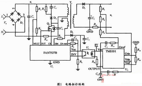 圖中C1上的電壓為經過橋式整流后的電壓,Rs1采樣流過MOS管的電流,進行逐周期限電流控制,使MOS管的電流峰值不至于太大,確保負載短路時變壓器不發生磁飽和。利用輔助繞組完成變壓器一次繞組的電流過零檢測(APFC變壓器去磁),控制功率開關管Q2重新開始下一個開關導通工作周期的工作,FAN7527B的Idet引腳外接的電阻R4阻值在幾十千歐的范圍內,使電路工作于“準零電壓導通”的工作方式。R4電阻值取值和變壓器的一次繞組的電感量和功率開關管MOSFET的輸出電容有關,具體電阻值可以通過實驗來確定,本電路中取值為33K。Rs2采樣負載LED電流信號,R7、R8構成分壓網絡對LED上的電壓進行采樣。Rs2采樣LED上的電流與TM101上的基準信號CVin進行比較,經誤差經放大器對輸出進行恒流控制,LED的亮度和流過LED的電流大小基本成正比的,只要控制流過LED的電流大小就可以調節LED的亮度。R7、R8采樣LED上的電壓與TM101上的基準信號CVin進行比較,經誤差放大器對輸出電壓控制,送入TM101的這兩路信號相“與”后通過光耦送入控制芯片FAN75 27B的誤差放大器進入乘法器。乘法器另一路是通過R13、R19、R23和R27采樣經全波整流后的市電信號,這兩路信號的乘積就是乘法器輸出,該輸出信號使得電感電流跟蹤乘法器的輸出波形信號,產生的PWM脈沖控制MOS管Q1的開關,實現對負載電流和輸入電流的控制,完成LED實現對LED的恒流限壓控制和輸入功率因數的校正。