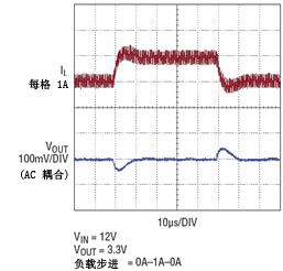 為了減少外部組件數目、降低成本并節省設計時間,開關頻率和環路補償可以用簡單的引腳設置。圖 1 顯示了一個典型應用。為了能以 2MHz 頻率工作,振蕩器頻率設定引腳 (RT) 連接到內部 3.3V 穩壓器輸出引腳 (INTVCC)。當補償引腳 (ITH) 連接到 INTVCC 時,運用默認補償,從而產生一個干凈的負載瞬態響應 (圖 2)。
