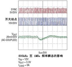 有些應用在工作時要求移動開關頻率,通常是為了避開相鄰無線接收器的干擾。圖 3 顯示了甚至當 MODE/SYNC 引腳引入的同步頻率迅速變化時,輸出電壓的偏離也是很小。