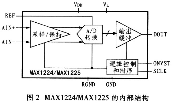 MAX1224/MAX1225采用輸入采樣,保持和逐次逼近寄存器(SAR)電路,將模擬輸入信號轉換為12位數字輸出信號。串行接口僅需要3條連接線(SCLK、CNVST和DOUT),提供了與微處理器(μP)和DSP的便利連接。圖2給出簡化的MAX1224/MAX1225內部結構。