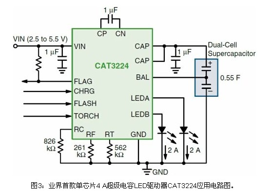 CAT3224則是業(yè)界首款4 A單芯片超級電容LED驅(qū)動器(見圖3),集成了雙模1x/2x電荷泵,提供三項關(guān)鍵功能:精密的超級電容充電控制、電流放電至LED閃光的管理,以及為LED手電筒模式提供恒流。這三種模式的工作電流能以3顆外部電阻作簡易編程,能吸收達(dá)4 A的LED閃光脈沖電流。超級電容技術(shù)的高峰值電流優(yōu)勢,結(jié)合CAT3224簡單的并行邏輯接口,使這器件成為采用LED替代氙氣燈的應(yīng)用的極佳選擇。