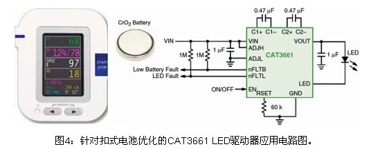 如今,越來越多的創(chuàng)新型便攜設(shè)備采用扣式電池(coin cell)供電,如醫(yī)療應(yīng)用中的血糖儀、數(shù)字體溫計、血氧計、呼吸分析儀和生理監(jiān)測儀等。由于這種電池的獨特特性以及需要長工作壽命,這些緊湊型應(yīng)用需要定制的LED驅(qū)動器,不僅要管理背光,還要監(jiān)測電池電量。在這類應(yīng)用中,可以采用安森美半導(dǎo)體計劃于2010年下半年推出的CAT3661 2至2.5 V單LED驅(qū)動器。這器件同樣采用安森美半導(dǎo)體專利的四模(Quad Mode)電荷泵架構(gòu),能效高達(dá)92%,靜態(tài)電流低至約150 μA,提供可調(diào)節(jié)的低電池電量檢測功能,以及強固的LED故障監(jiān)測、軟啟動和短路限制等保護功能,采用低高度的3 x 3 mm TQFN-16封裝,非常適合這些便攜設(shè)備應(yīng)用。