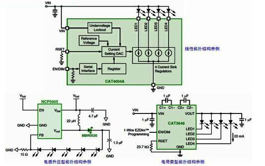 白光LED廣泛用于小型液晶顯示器(LCD)面板及鍵盤背光以及指示器應(yīng)用。高亮度LED則用于手機和數(shù)碼相機的閃光光源。這些應(yīng)用需要優(yōu)化的驅(qū)動器解決方案,能夠延長電池使用時間、減小印制電路板(PCB)面積及高度。在這些應(yīng)用領(lǐng)域,常見的LED驅(qū)動器方案涉及線性、電感型或電荷泵型不同拓?fù)浣Y(jié)構(gòu),各有其特點。例如,電感型方案總能效最佳;電荷泵方案由于使用低高度陶瓷電容,占用的電路板面積和高度極小;線性方案非常適合色彩指示器以及簡單的背光應(yīng)用。安森美半導(dǎo)體提供所有這三種類型拓?fù)浣Y(jié)構(gòu)的LED驅(qū)動器方案(參見圖1),滿足用戶不同的應(yīng)用需求。