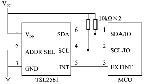 TSL2561可以通過I2C總線訪問,所以硬件接口電路非常簡單。如果所選用的微控制器帶有I2C總線控制器,則將該總線的時鐘線和數(shù)據(jù)線直接與TSL2561的I2C總線的SCL和SDA分別相連;如果微控制器內(nèi)部沒有上拉電阻,則還需要再用2個上拉電阻接到總線上。如果微控制器不帶I2C總線控制器,則將TSL2561的I2C總線的SCL和SDA與普通I/O口連接即可;但編程時需要模擬I2C總線的時序來訪問TSL2561,INT引腳接微控制器的外部中斷。硬件連接如圖3所示。