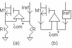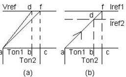 傳統的開關電源控制電路中,電流極限比較器結構如圖1(a)所示,檢測電流由M1(senseMOSFET)流入由多個開關管和電阻組成的網絡R1中,該網絡通過控制開關管導通或關斷,改變R1的電阻值,得到不同的占空比。另外一基準電流流過一阻值固定的電阻R,產生一固定參考電壓。當R1的壓降隨檢測電流上升到參考電壓時,比較器關斷功率管,保證輸出電壓穩定。其工作原理如圖2(a)所示,例如:R1上的電壓從a上升到d,從而關斷功率管產生一占空比,當改變R1的電阻值,R1上的電壓從a上升到f得到另一占空比。從圖1(a)可以看出:傳統的開關電源電流極限比較器是將兩種電流先轉化成電壓再進行比較,需要占芯片面積非常大的電阻網絡和開關管,并且為保證電阻精度,一般需要激光修調技術,這大大增加了芯片成本。因此本文在此基礎上提出一種新型的電流極限比較器結構。
