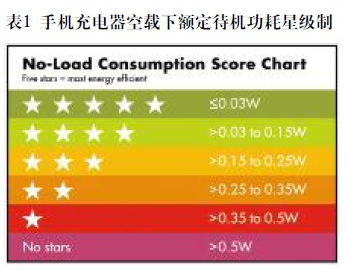 這些關(guān)注的結(jié)果是采取一系列措施來(lái)提升效率和降低空載功耗的需求。其中最新最嚴(yán)格的是由全球前五大手機(jī)廠商提出的一項(xiàng)自愿性的充電器星級(jí)制協(xié)定,用以標(biāo)志在充電完成之后,充電器仍插在壁式插座上時(shí)的耗能量。該星級(jí)制從0星級(jí)開始,最高5星級(jí)。空載下額定待機(jī)功耗大于0.5W的充電器為0星級(jí)標(biāo)簽,待機(jī)功耗小于0.03W(30mW)的為5星級(jí)(見表1)。通過(guò)比較,大多數(shù)現(xiàn)有手機(jī)的待機(jī)功耗在150~300mW范圍。