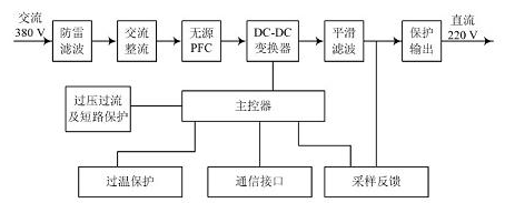 本文設計的整流模塊的工作原理框圖如圖2 所示,工作時, 模塊首先通過過防雷處理和濾波對輸入的三相交流進行處理,這樣才能保證模塊后級電路的安全; 經過處理后的三相交流經過整流和無源PFC 后轉換成高壓直流時,這時轉換的高壓直流要經過DC/DC變換器再次轉換成可變的直流電壓輸出; 另外模塊控制部分還有負責過壓、過流以及短路保護等作用,這樣才能保證輸出電壓的穩定, 也同時能對模塊各部件進行保護。模塊還在遠程監控中提供了 四遙 (遙控、遙調、遙測、遙信) 接口。[page]