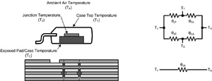 現(xiàn)在來快速了解一下如何進行不含散熱片的簡單PCB散熱設(shè)計,圖3示意了模塊及作為熱阻抗的PCB。與從結(jié)到裸片焊盤的熱阻抗相比,由于結(jié)與外封裝頂部間的熱阻抗相對較高,因此在第一次估計從結(jié)到周圍空氣的熱阻(θJT)時,我們可以忽略θJA散熱路徑。